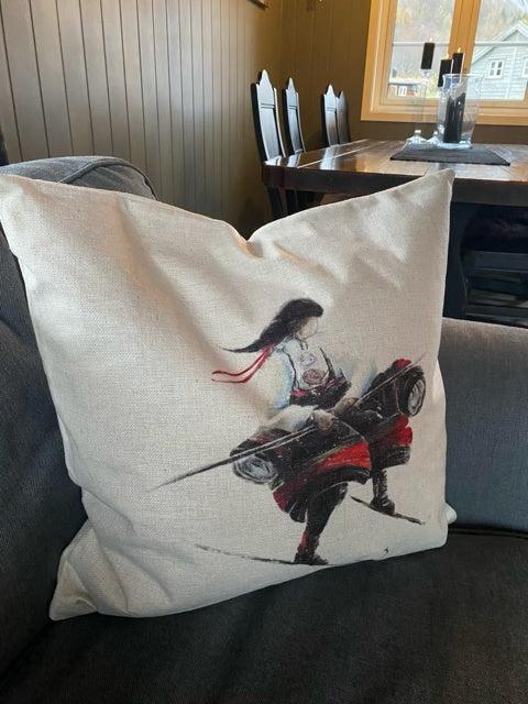 Pynteputetrekk i naturfarge laget i myk lin. Trykk av Mona Ida.