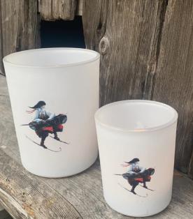 Små fine telysestakholder av glass med trykk av kunstneren Mona Ida.