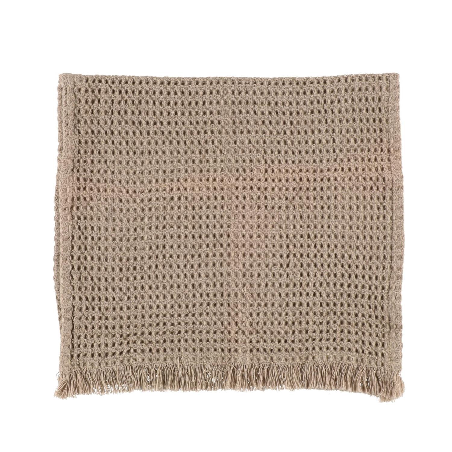 Fanni K Ruutu håndkle, laget av resirkulert vevd honningmateriale. Frynser på kortsidene. Hengeløkke på langsiden. Størrelse 30×50 cm. Materiale 100 % resirkulert bomull. Farge sand