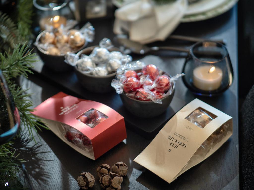 Melkesjokoladekuler fylt med deilig hasselnøttpraliné. Sjokoladekulene er pakket i skinnende rød folie og er svært dekorative i sjokoladeskålen.