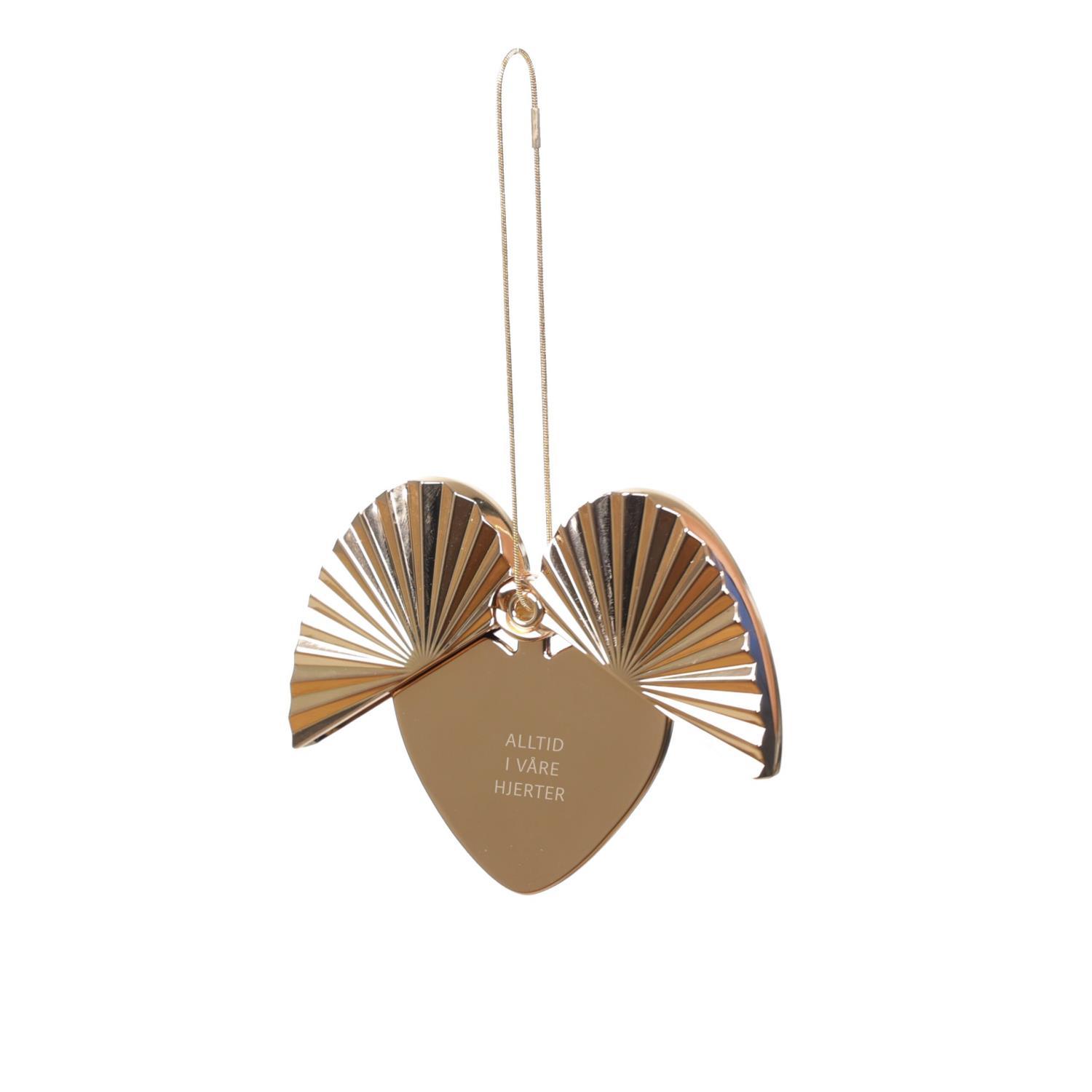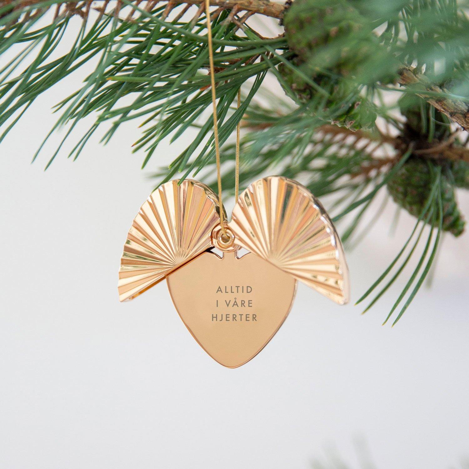Teksten passer spesielt godt i kombinasjon med disse englevingene. Ornamentet kan henge både lukket eller åpent, slik at de vakre “vingene” rammer inn hjertet og teksten. Designet av Solgunn Stensig for Pictureit.no, produsert i metall og forgylt med 14 karat gull. Dette er en personlig gave som blir tatt frem år etter år – og som mange samler på. Hver jul lanserer vi en ny variant i serien.