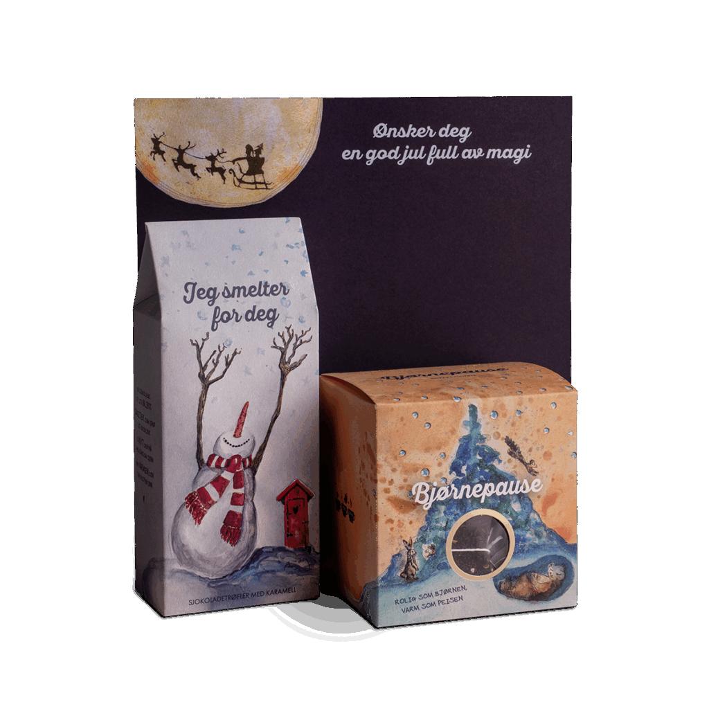 En liten gave med stor hygge! Nyt de myke sjokoladetrøflene «Jeg smelter for deg», rullet i kakaopulver og med små biter av salt toffee, sammen med en kopp Bjørnepause Vinterte, sort te med sitrusskall, nellik, kanel og vaniljebiter.