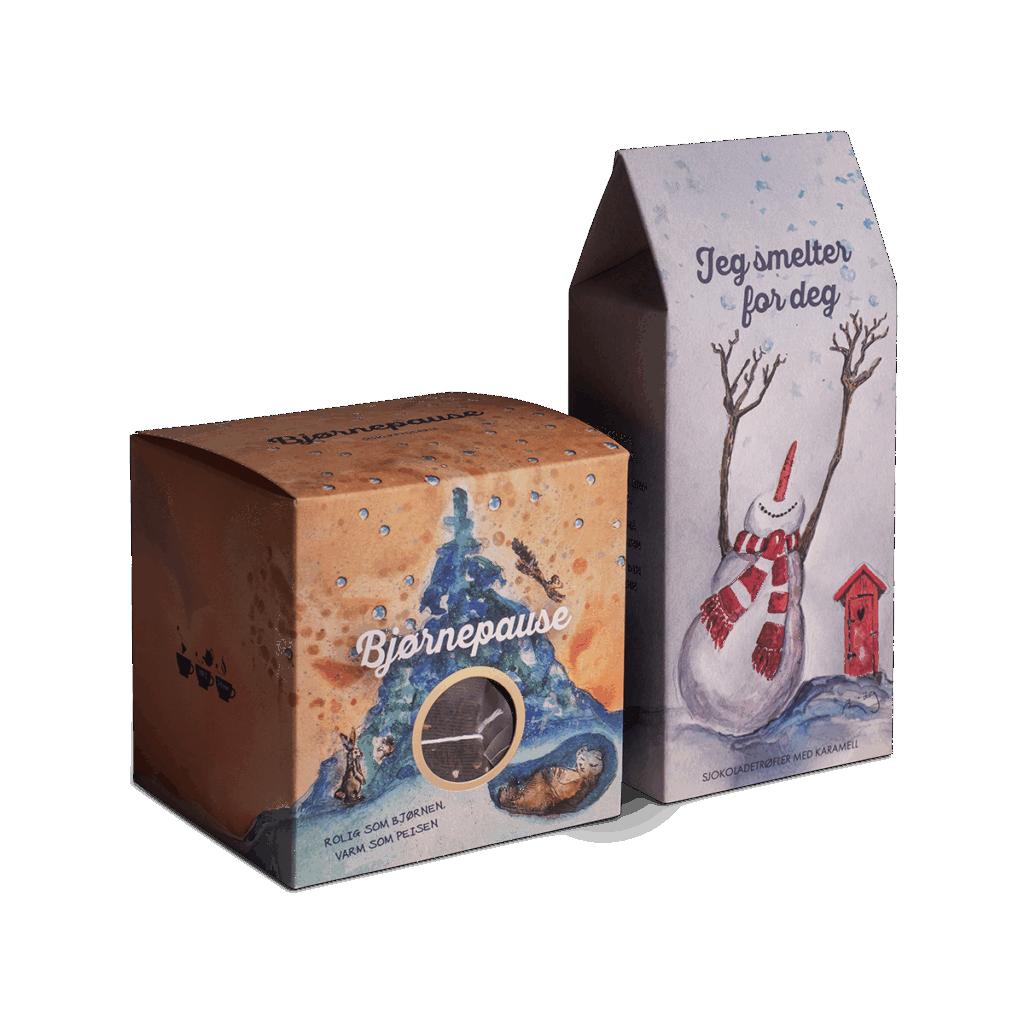 Illustrert av kunstner Bjørg Thorhallsdottir, som med sitt lekne og poetiske uttrykk gjør pakken til en liten kunstopplevelse. Perfekt for deg som vil nyte et øyeblikk med varme, sødme og litt ekstra kjærlighet i vinterkulden.
