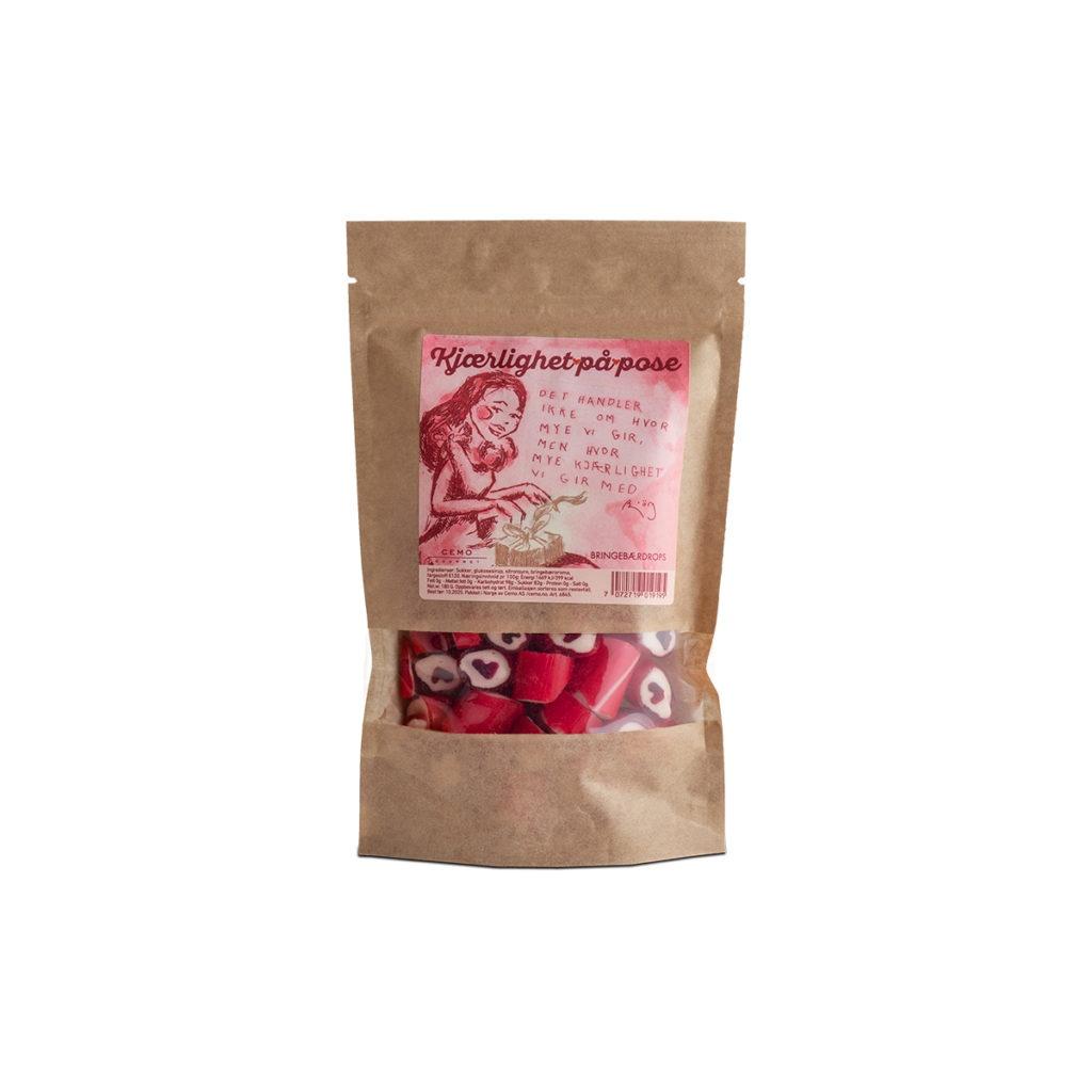 «Kjærlighet på pose» er søte bringebærdrops, sammen med en dose kjærlighet. Illustrert av kunstner Bjørg Thorhallsdottir.
