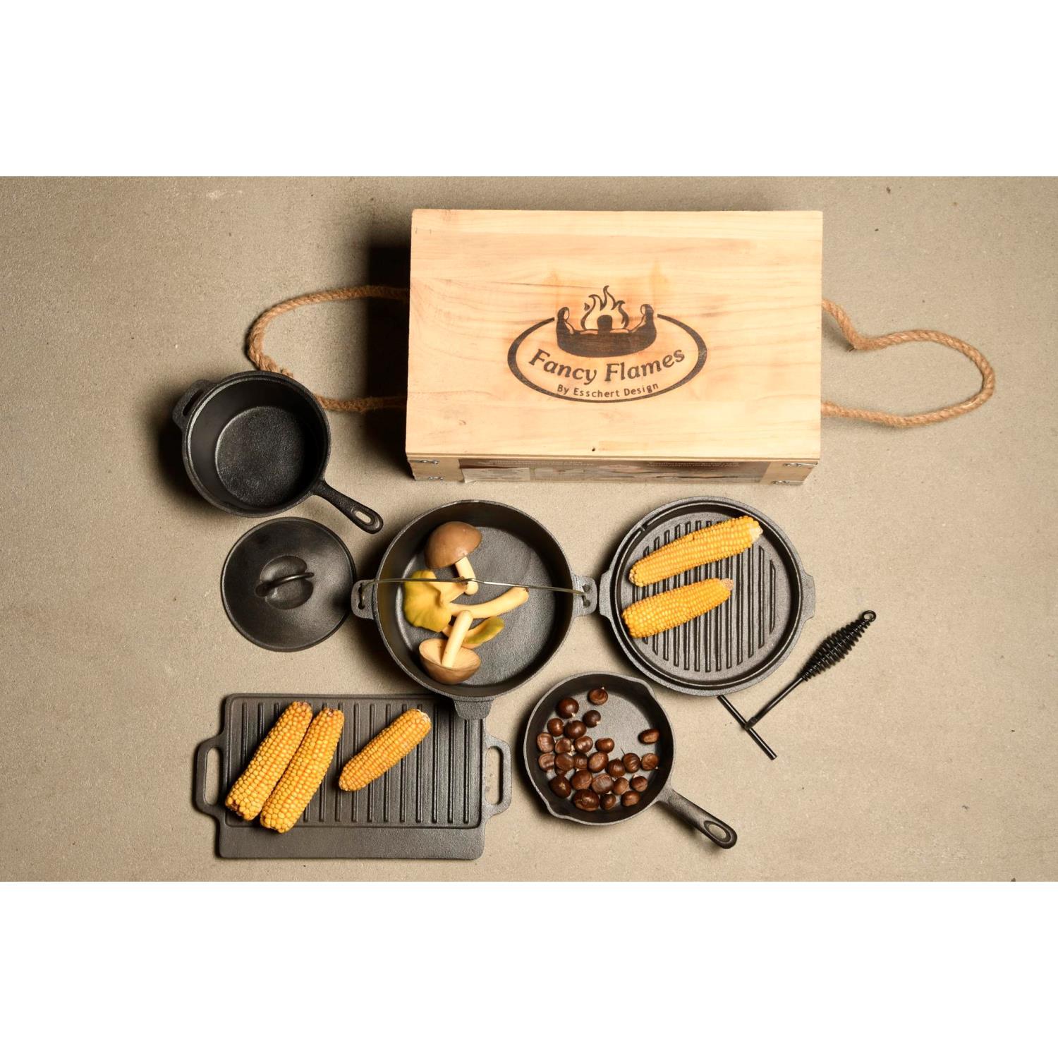 Kokesett for bålpanne, leveres i treeske. Inneholder stekeplate, stekepanne, stor gryte med lokk, liten gryte med lokk og løftekrok til lokkene.