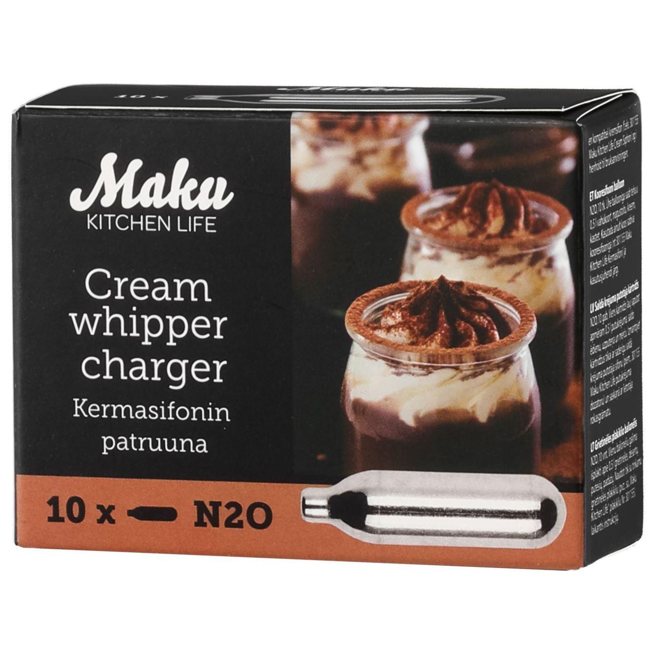 Pakken inneholder 10 kremsifonpatroner. Én patron kan piske omtrent 0,5 l pisket krem, desserter, mousser og sauser. Bruk patronene kun med en kompatibel kremsifon (f.eks. 301155 Maku Kitchen Life Cream Siphon) og i henhold til bruksanvisningen.