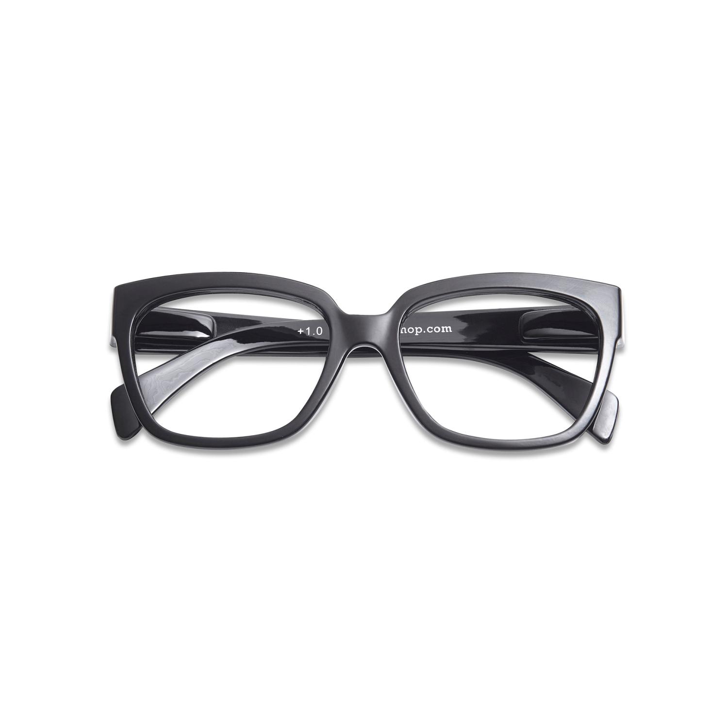 Store, firkantede lesebriller med blank, svart innfatning. ‘Mood’ fra Have A Look er imponerende store og firkantede, men samtidig overraskende lette og komfortable å bære. Den markante innfatningen har flatterende, lett oppadgående hjørner i et design som rammer inn ansiktet vakkert og tilfører karakter. Spesielt godt egnet for runde, ovale og hjerteformede ansiktsformer.