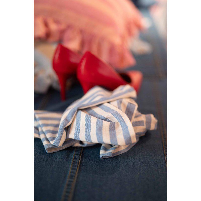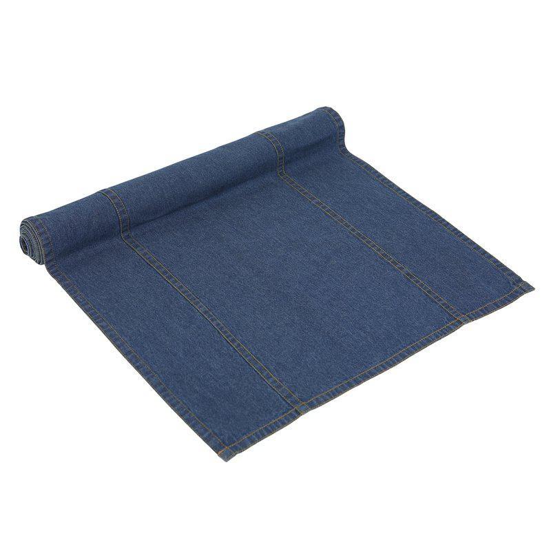 Løper laget av vasket denim, som gir den en myk og behagelig følelse med en autentisk jeanskarakter. Den er dekorert med doble dekorative jeans-sømmer som går langs kantene, noe som skaper en stilig kontrast og forsterker dens moderne og stilrene uttrykk.