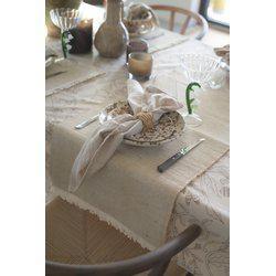 En enkel og fin spisebrikke i jute- og bomullsblanding er en tidløs klassiker som passer perfekt til både hverdag og fest. Den naturlige strukturen i materialet gir et rustikt, men stilrent uttrykk. De dekorative frynsene i endene gir en myk og sjarmerende avslutning.