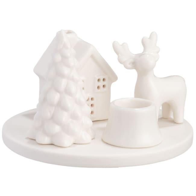 En vakker lysestake med vinterlige detaljer. Den hvite keramiske lysestaken utstråler en fredelig festlig atmosfære. Den er dekorert med et vinterlandskap, hvor et lite hus, et grantre og et reinsdyr danner en vakker helhet. Det enkle designet og den helhvite fargen gjør den enkel å kombinere som en del av hjemmets vinterdekor.