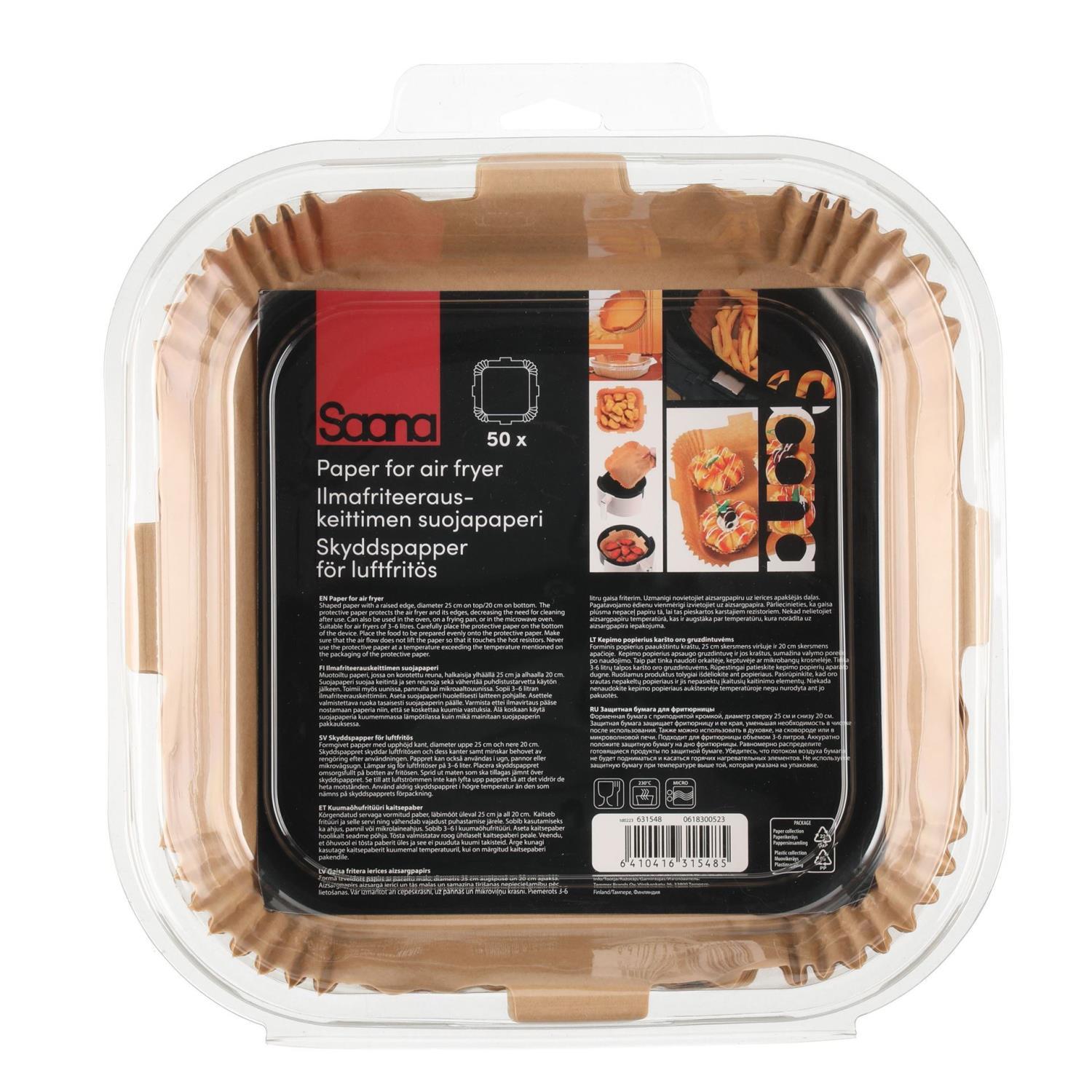 Det praktiske, formede beskyttelsespapiret beskytter airfryeren og dens kanter, reduserer behovet for rengjøring etter bruk. Papiret har forhøyede kanter for å redusere søl og matsmuler fra å komme inn i komfyren. Papiret kan også brukes i ovn, panne og mikrobølgeovn. 25x25x7cm. Varmemotstand maks. 230 grader. Passer til 3-6 liters airfryers.