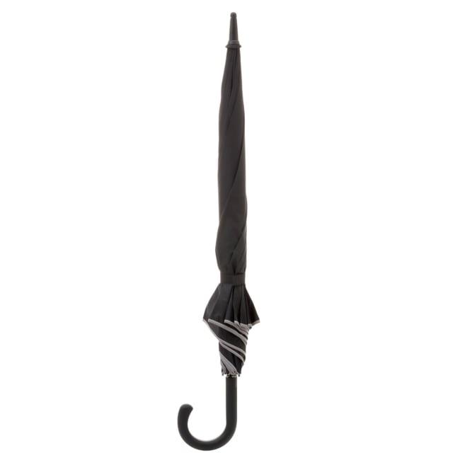 Stor sort paraply Diameter 120 cm Reflekterende stripe 8 paneler Automatisk åpningsmekanisme Krokhåndtak og knapp på håndtaket.