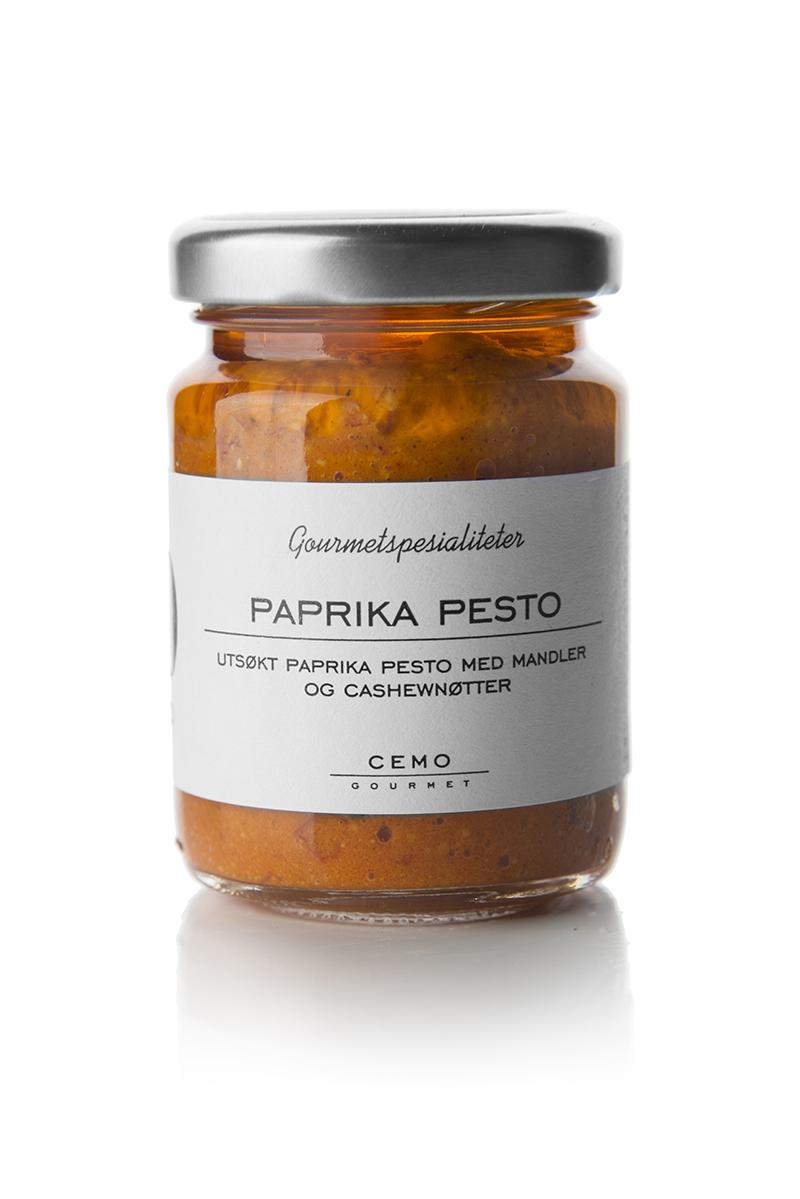Ingredienser: Paprika, solsikkeolje, tomatekstrakt, cashewnøtter, mandler, løk, salt, modnet parmesan (melk, salt, rennet), basilikum, hvitløk, vineddik, fruktose, merian, pinjekjerner, mandelaroma, melkesyre E270. Nettovekt: 90 g