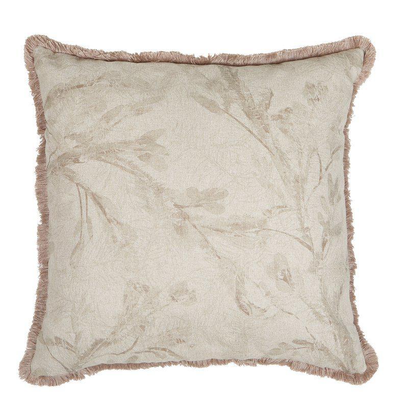 Elegant putetrekk med et vilsomt ton-i-ton mønster, der et linfarget blomster- og bladmønster skaper en harmonisk og naturlig følelse. Putetrekket er prydet med en nett og dekorativ frynse rundt hele, som løfter designen og tilfører en sofistikert detalj.