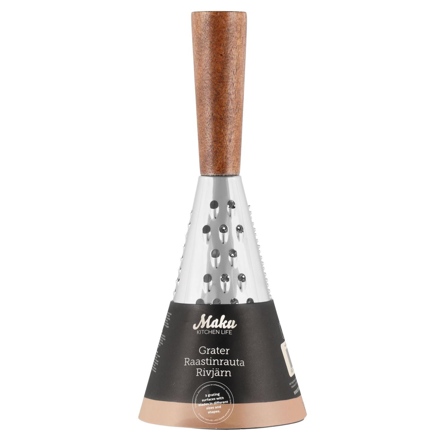 Dette koniske rivjernet med trehåndtak og gummibunnkant har 3 forskjellige ristflater, hver med forskjellige størrelser og fasonger av skarpe kniver slik at du kan rive eller pynte maten med presisjon. Det er det perfekte verktøyet med en komfortabel design for å rive/skjære/skjære diverse matvarer som ost, frukt, grønnsaker, salat, sjokolade, nøtter og mye mer. Håndvask.