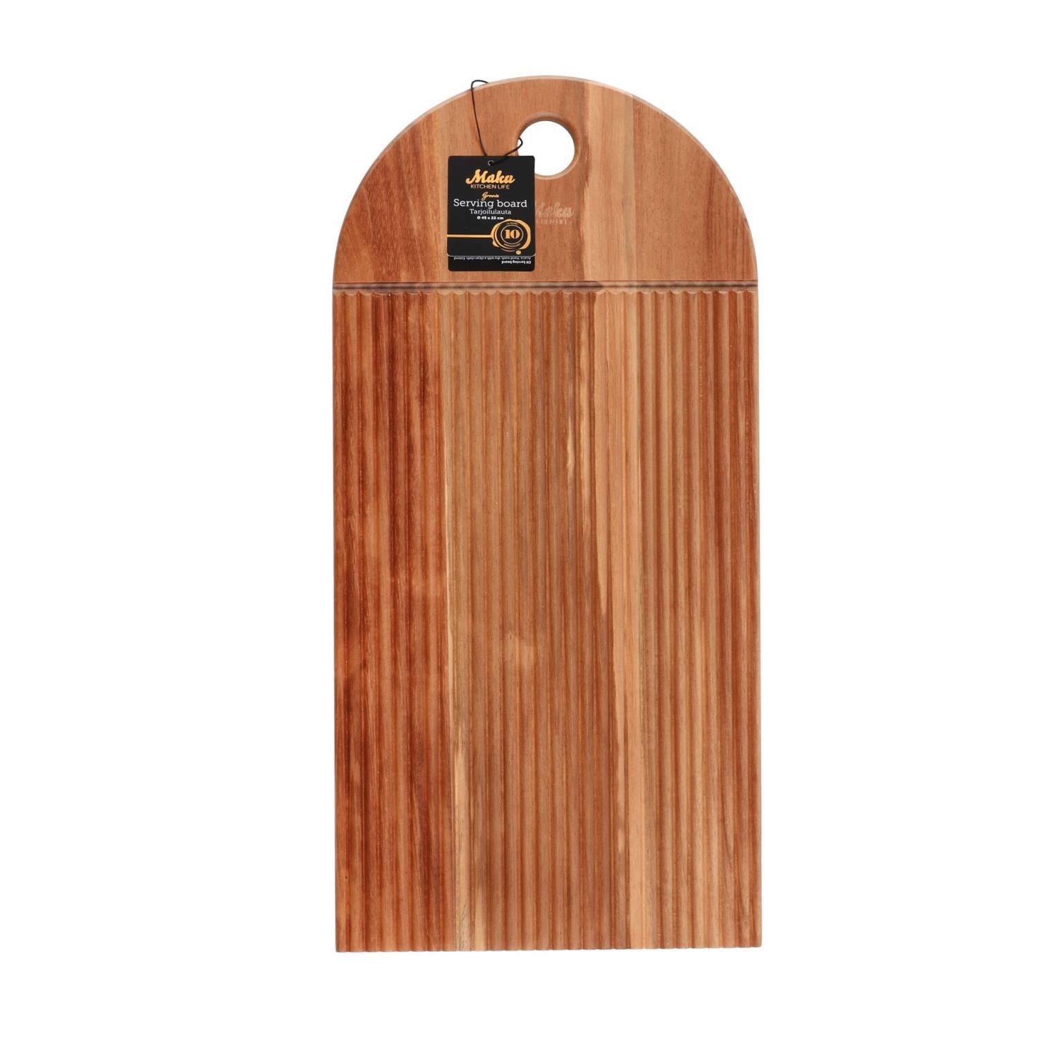 Maku Groove serveringsbrett er perfekt for alle slags serveringer, enten det er ost, frukt eller antipasti. Serveringsbrettet gir et snev av naturlig skjønnhet og eleganse til enhver borddekking. Lett å rengjøre og vedlikeholde – håndvask og tørk med en ren klut er nok. Forleng produktets levetid ved å behandle det med vegetabilsk olje fra tid til annen, slik at treverket beholder sitt vakre utseende og holdbarhet.
