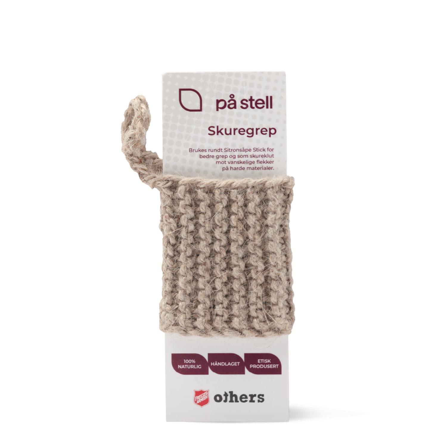 Skuregrepet er laget av 100% jute, et naturlig antibakterielt fiber som ikke riper. Hylsteret gir et godt grep rundt Sitronsåpe Stick og er supert til å bruke til å skrubbe ekstra vanskelige flekker på harde materialer. Fester seg godt til såpen når den kommer i kontakt med vann og holder seg fast selv når såpen minker med bruk. Etisk produsert gjennom Frelsesarmeens sosiale arbeid i Bangladesh.