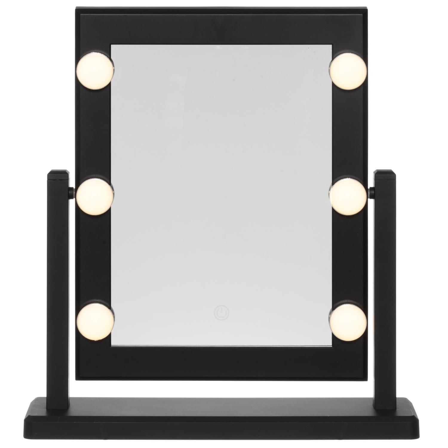 Sminkespeil med 6 LED-lamper for optimal belysning ved påføring av sminke. Du kan velge mellom kald eller varm belysning. Speilet slås av/på med en berøringsknapp. Størrelse på speildelen 20,5 x 29 cm. Batterier 4 x AAA (ikke inkludert).