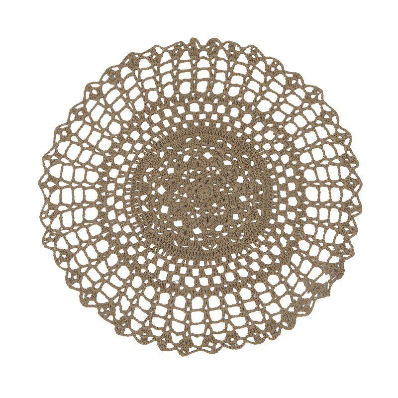 En rund, ensfarget bordbrikke som er håndheklet. Den fine hekleteknikken skaper et mønster med detaljerte masker, som gir en følelse av håndverk, tradisjon og nostalgi.