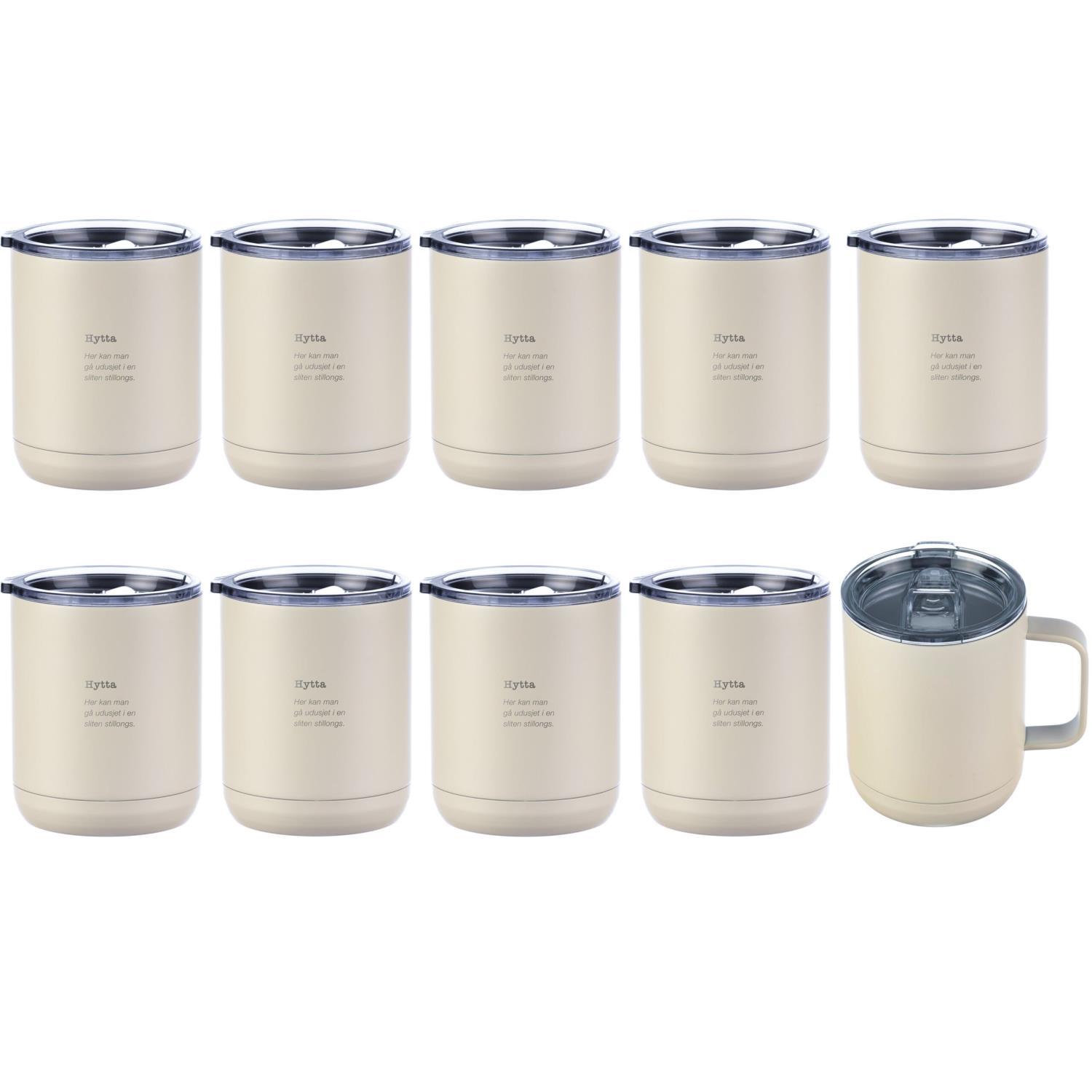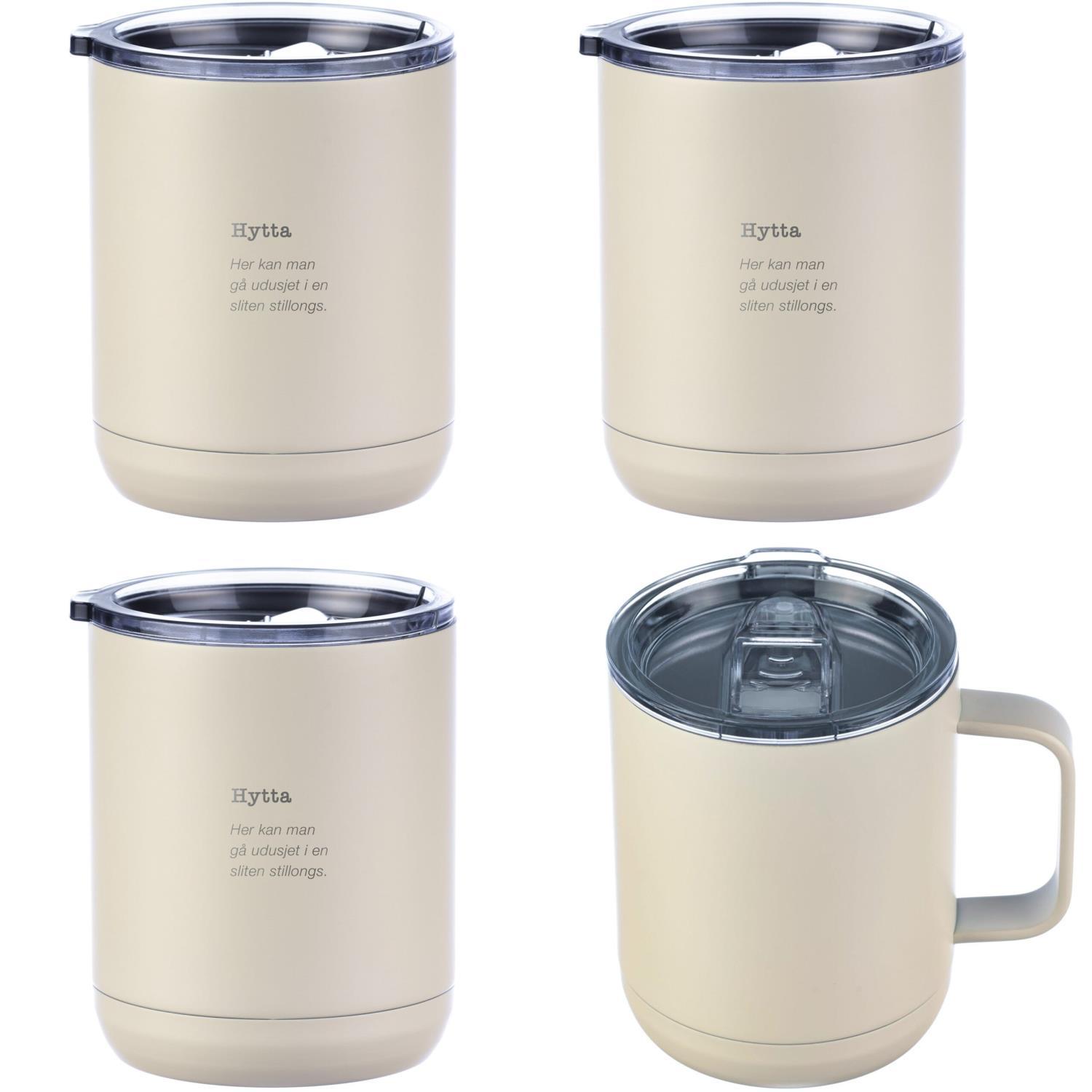 Termokopp med hank til Hytta. Denne stilige termokoppen er et must til alle seriøse hyttefolk. Teksten på koppen er: